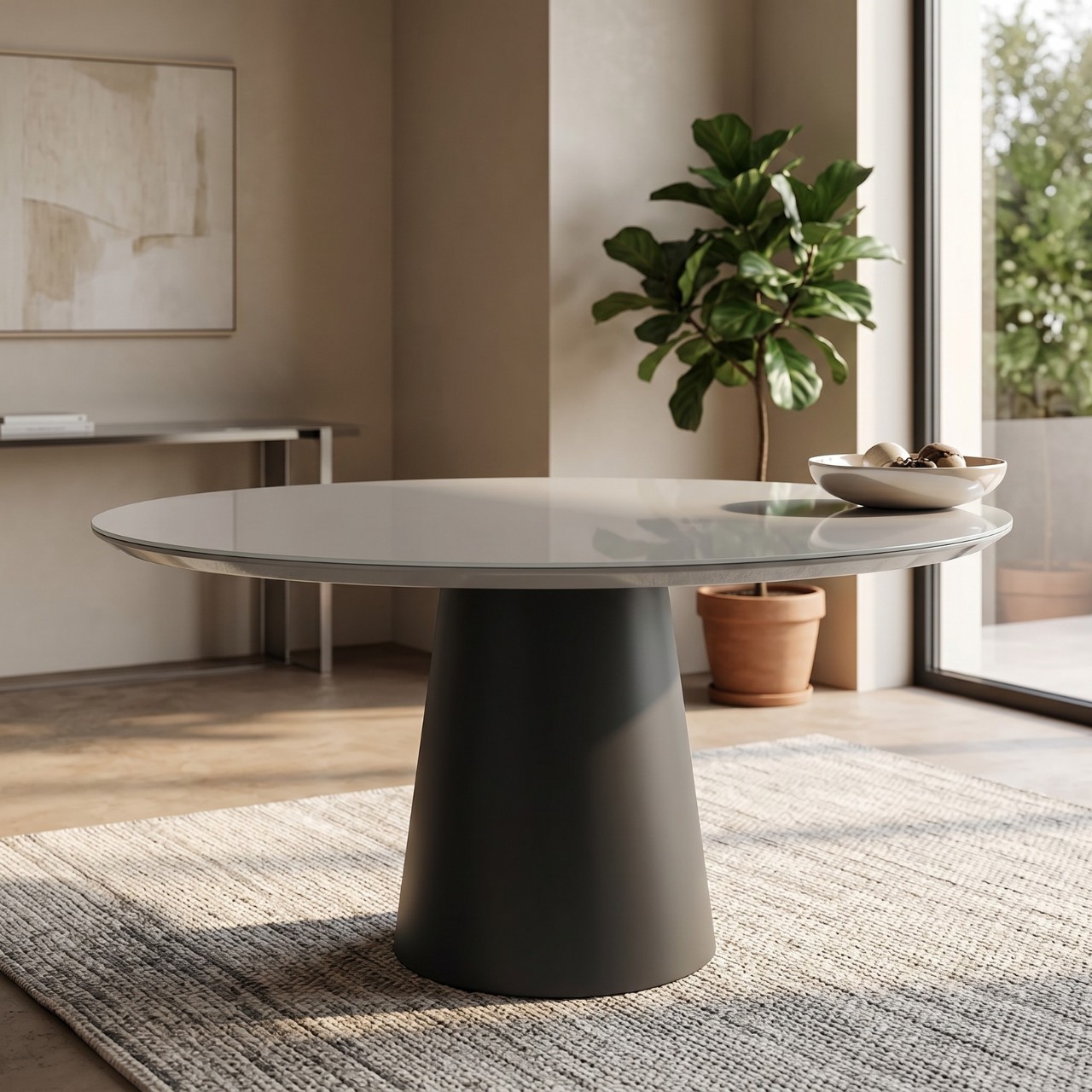 A Mesa de Jantar Cone com 1,36 metros de diâmetro é uma peça de mobiliário encantadora e moderna, perfeita para a sua sala de jantar. O seu design provavelmente apresenta um tampo circular suportado por uma base cônica, o que confere um visual elegante e contemporâneo ao ambiente.